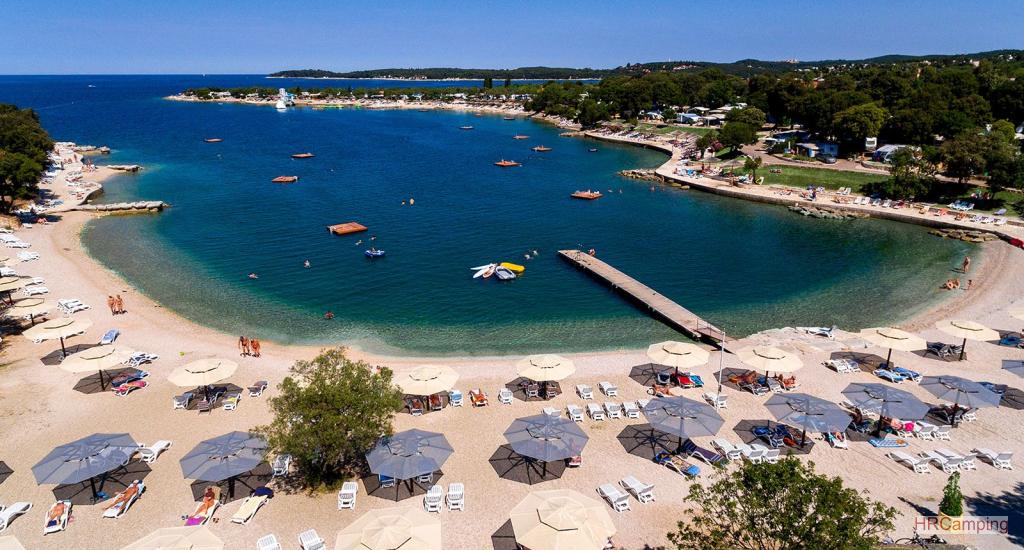 The Valalta Naturist Camp(FKK) in Rovinj is located near Rovinj and stretches along a 4 km long beach with various surfaces, including pebble and sandy sections and concrete sunbathing areas. Recent improvements include the installation of a gas filling station for up to 5 kg, a charging station for electric vehicles, a new children's playground, the renovation and construction of new toilets and a cycle path leading to Rovinj. The campsite offers a wide range of accommodation, including pitches with electricity and water and sewerage connections, modern mobile homes, bungalows and fully equipped apartments. Guests can enjoy a well-kept beach with free sun loungers and umbrellas, a seawater pool complex, outdoor heated pools and hot tubs. The camp also has a new wellness centre with indoor and outdoor pools, a Finnish sauna and a steam room. The campsite offers a shop, newsagent, fruit and vegetable shop, pharmacy, beauty salon and hairdresser. For a gastronomic experience, guests can sample seafood dishes, grilled specialities and local beer at the various restaurants on site.